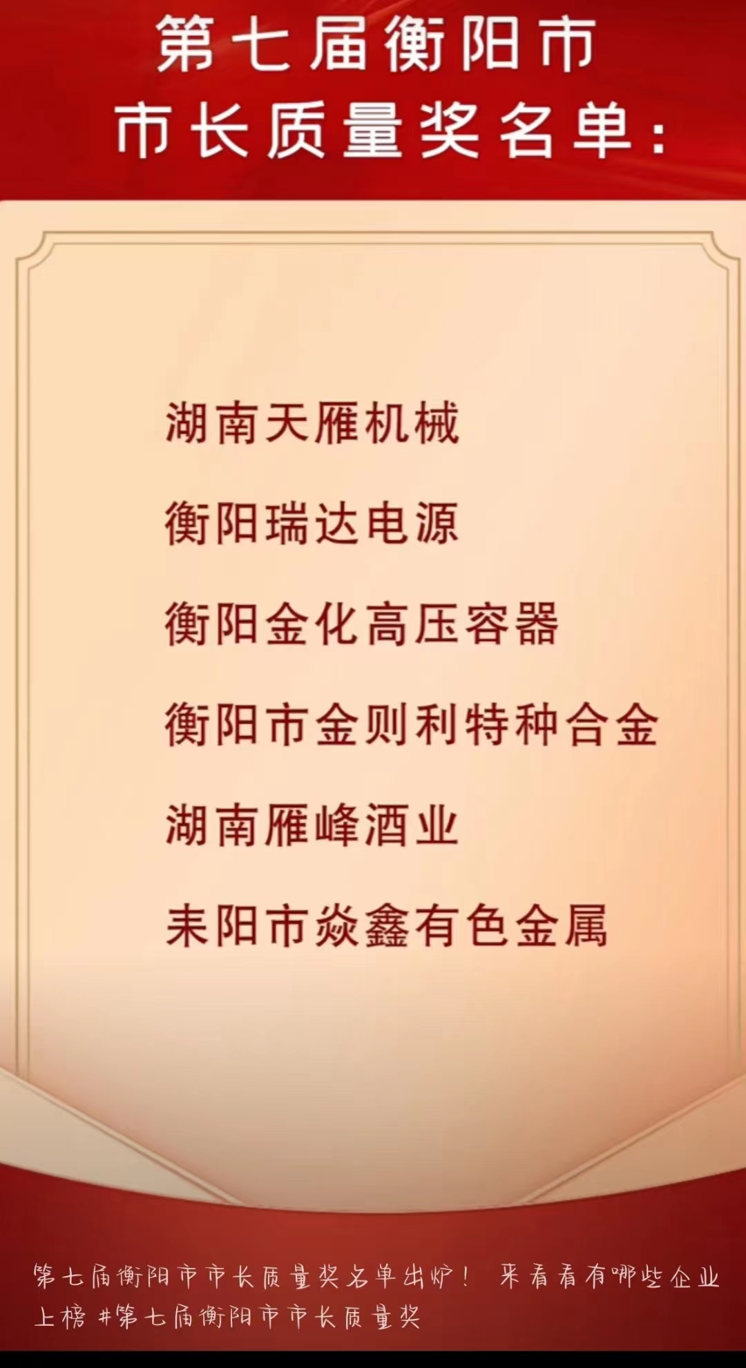 公司榮獲衡陽市第七屆市長質量獎